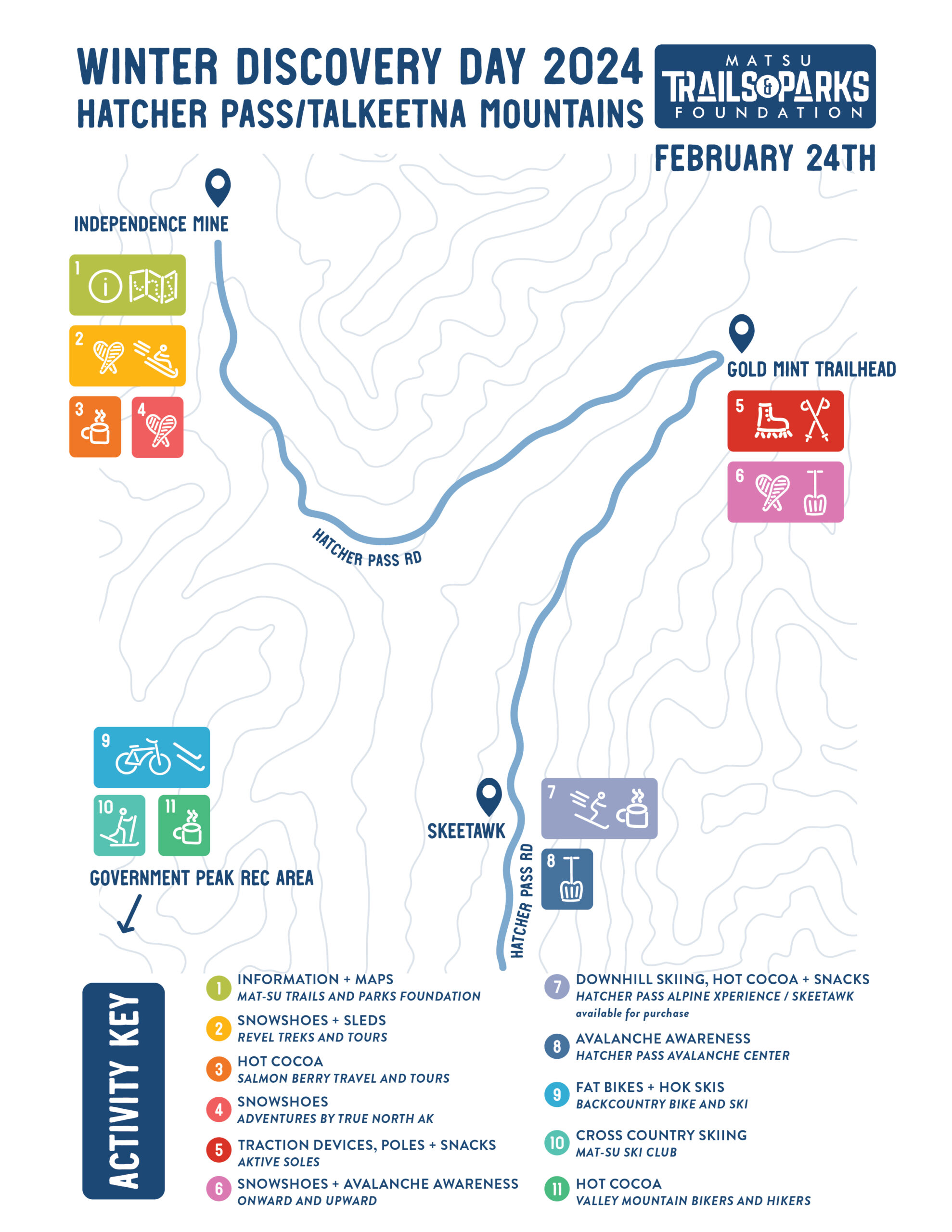 Mat-Su Trails and Parks Foundation is sponsoring Winter Discovery Day 2024, coordinated Revel Treks and Tours. The most comprehensive overview of event details can be found on the Revel website.