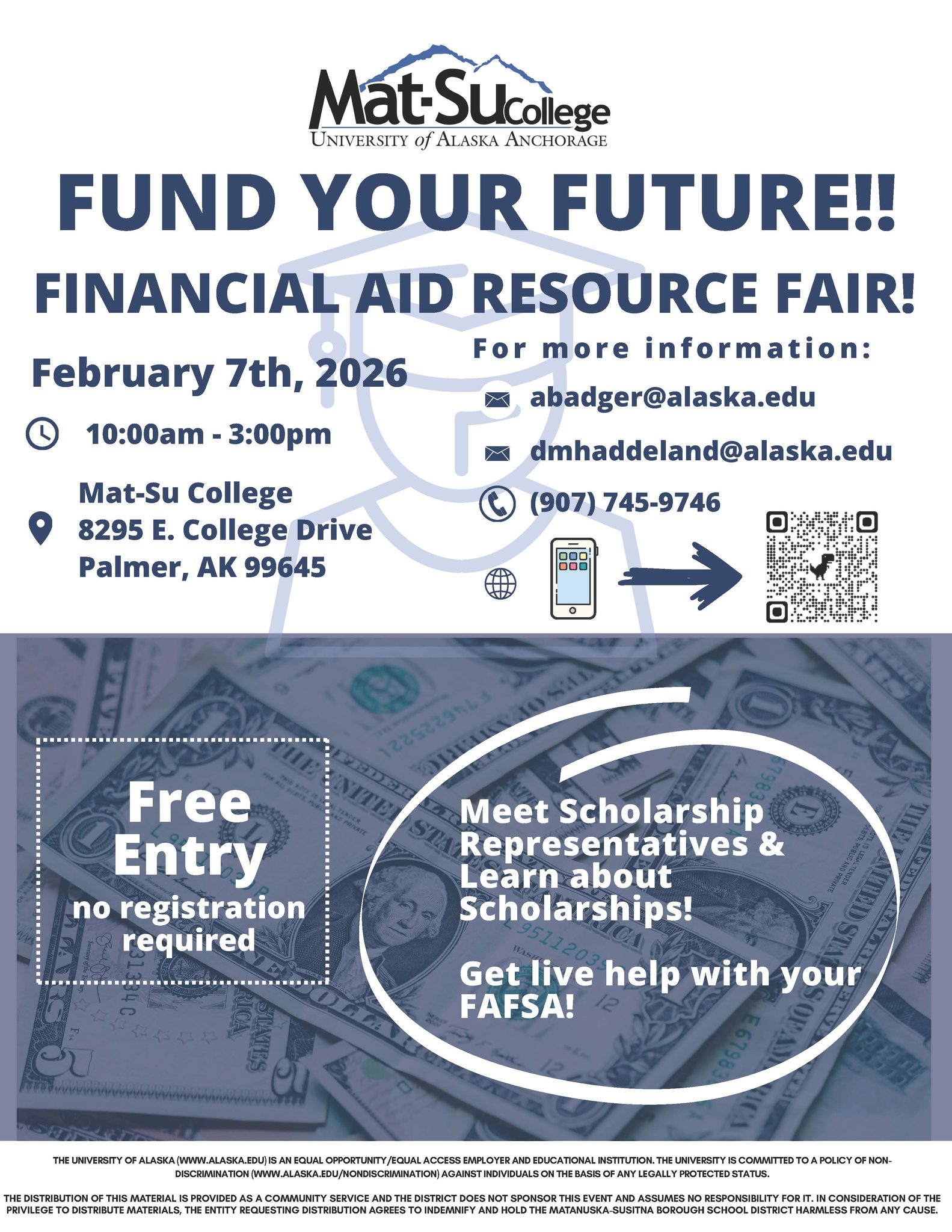Financial Aid Resource Fair will be held Saturday, February 7th, 2026. For the event, Mat-Su College’s Financial Aid Advisors will be giving information on grants and scholarships opportunities in the Valley. Our advisors will also be available to help students complete their Free Application for Federal Student Aid. The Fund Your Future Financial Aid Resource Fair is free and open to the public.